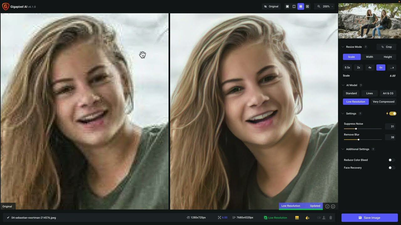 智能添加细节: 这是市面上唯一能在放大过程中,通过深度学习算法真正“找回”并添加逼真细节的放大工具。它不再仅仅是拉伸像素,而是智能重建缺失信息。